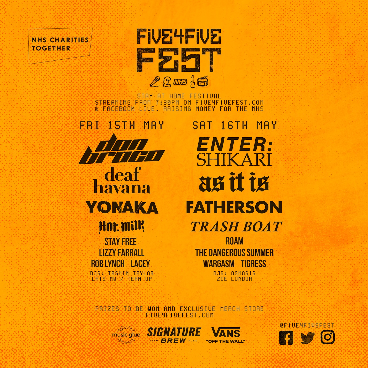 Along with standalone donations, festival viewers will also be able to donate to buy fixed price Five4Five Fest merch including t-shirts and posters. Raffle tickets can also be purchased to enter into a competition to win a range of prizes, including Enter Shikari and Don Broco signed drum skins, a signed test pressing of As It Is‘ album The Great Depression, signed handwritten lyrics from The Dangerous Summer and more.