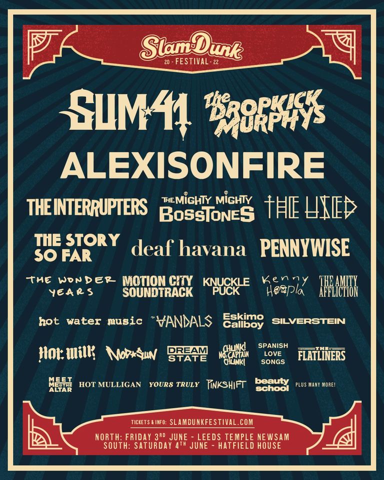 Sum 41 and Dropkick Murphys have been confirmed as headliners for the festival, alongside the previously announced Alexisonfire. It has also been confirmed that Rancid will no longer appear as headliners at the 2022 edition of Slam Dunk Festival.