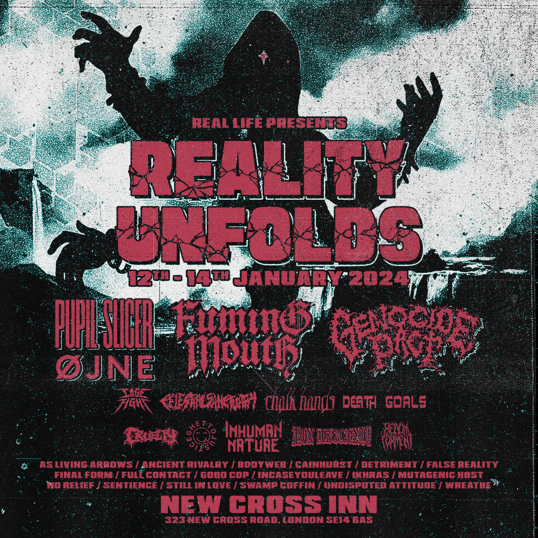 Reality Unfolds (organised by Real Life Presents) is taking place at New Cross Inn in London between 12th and 14th January 2024. Offering up a hefty dose of hardcore, screamo and extreme metal, the festival is returning for its second year. On Friday will be Pupil Slicer and Ojne as double headliners, Saturday sees the UK debut from Fuming Mouth and on Sunday, Genocide Pact will be making their first live appearance outside of the United States in their ten year History. Sounds good? Those are only the headliners.