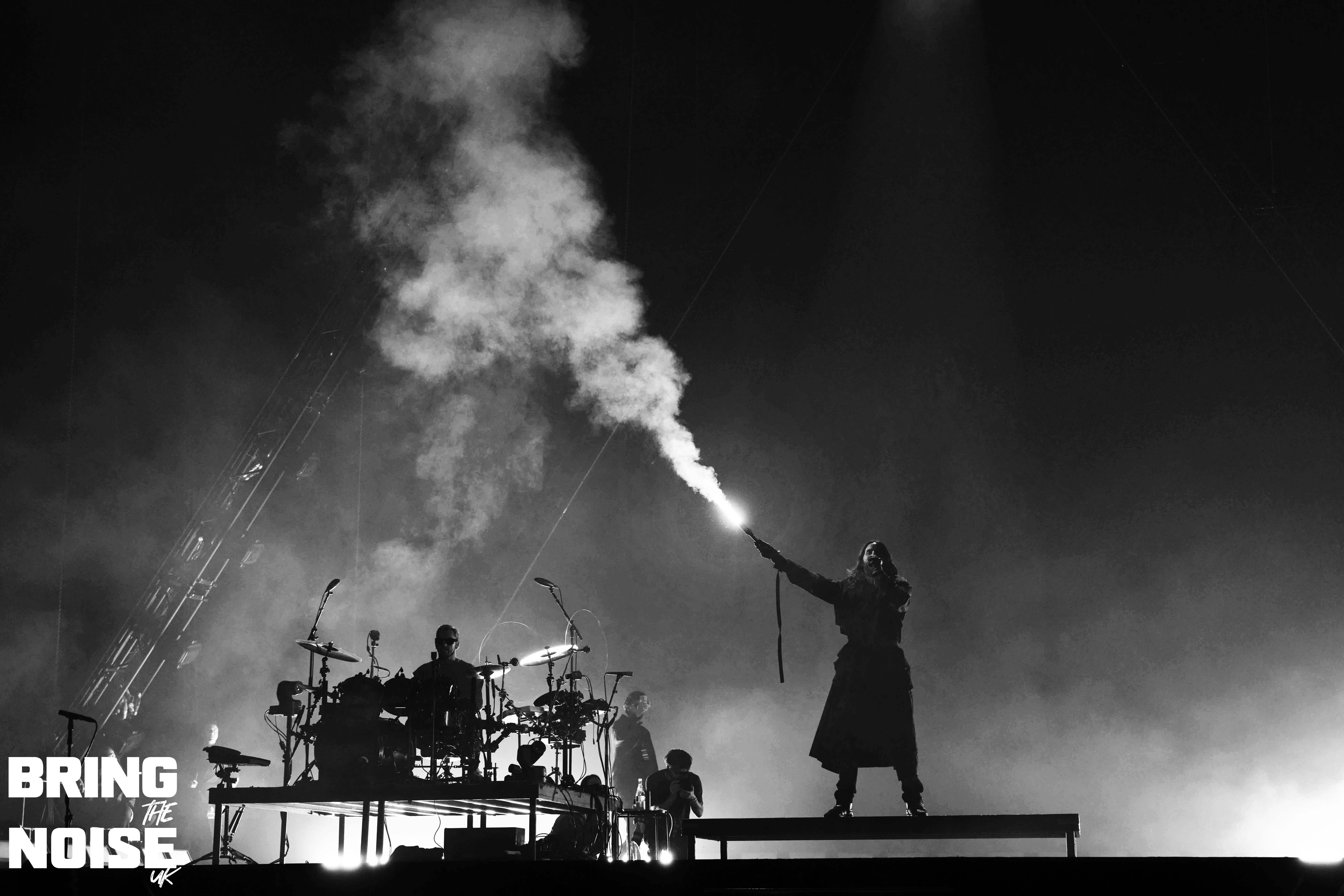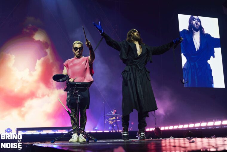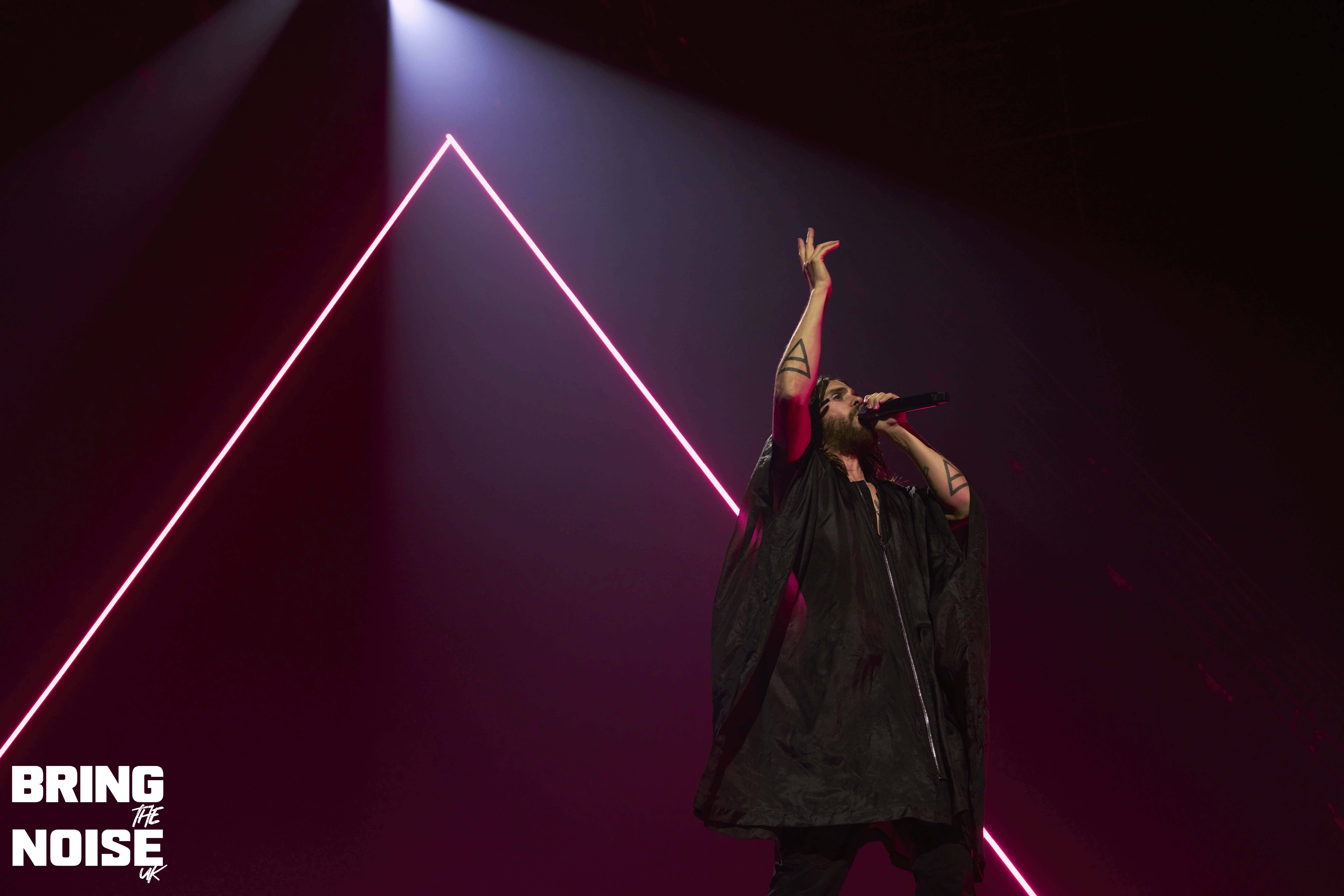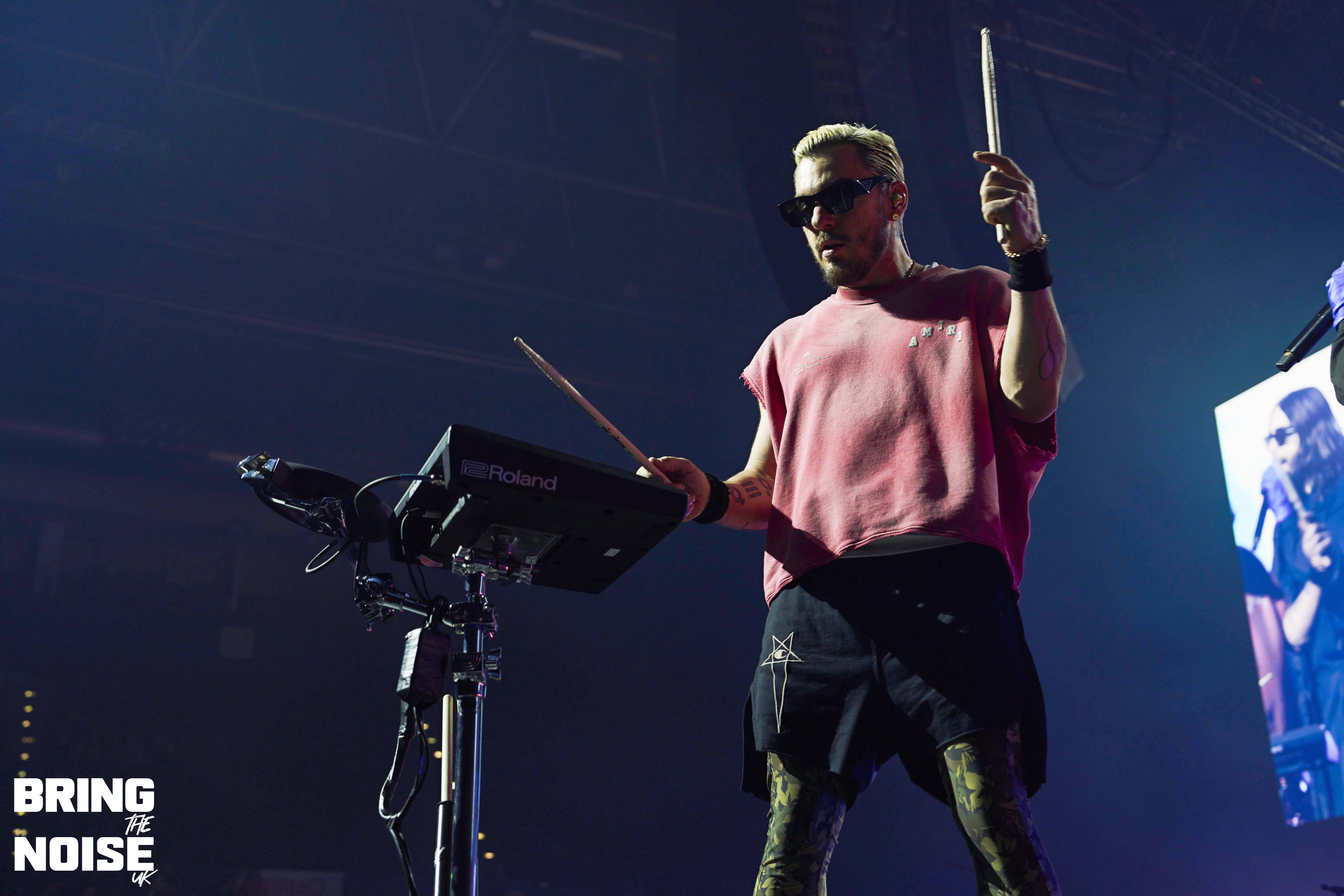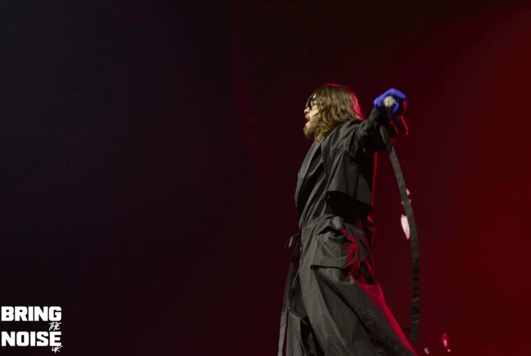 On a very poignant day when D-Day commemorations were happening around the UK and France Thirty Seconds To Mars brought their re-arranged tour to the OVO Hydro arena by the banks of the river Clyde. Singer and actor Jared Leto had acting commitments in April hence the tour being rescheduled to June, but it was well worth the wait that’s for sure. There would have been around 7000 in the arena at 7.30pm when Jagwar Twin (aka Roy English) took to the stage in traditional Scottish dress commenting that it feels pretty god damn sexy! Hailing from Orange County, California the trio on stage played a mixture of alternative rock, rap and breakbeats mainly from the 2022 album 33 with The Circle and Down To You opening the set. Soul Is A Star was a very emotional moment for Roy English, the guitarist plays an amazing solo before English tells the story of how last year was one of the hardest of his life, no money, no home, the phone torches were out for this special moment. This was another great example of how open modern musicians are to talking about their mental health. The mood was lightened a little after this as the crowd joined in a short version of the Scottish classic Ye Cannie Shove Yer Granny Aff The Bus!