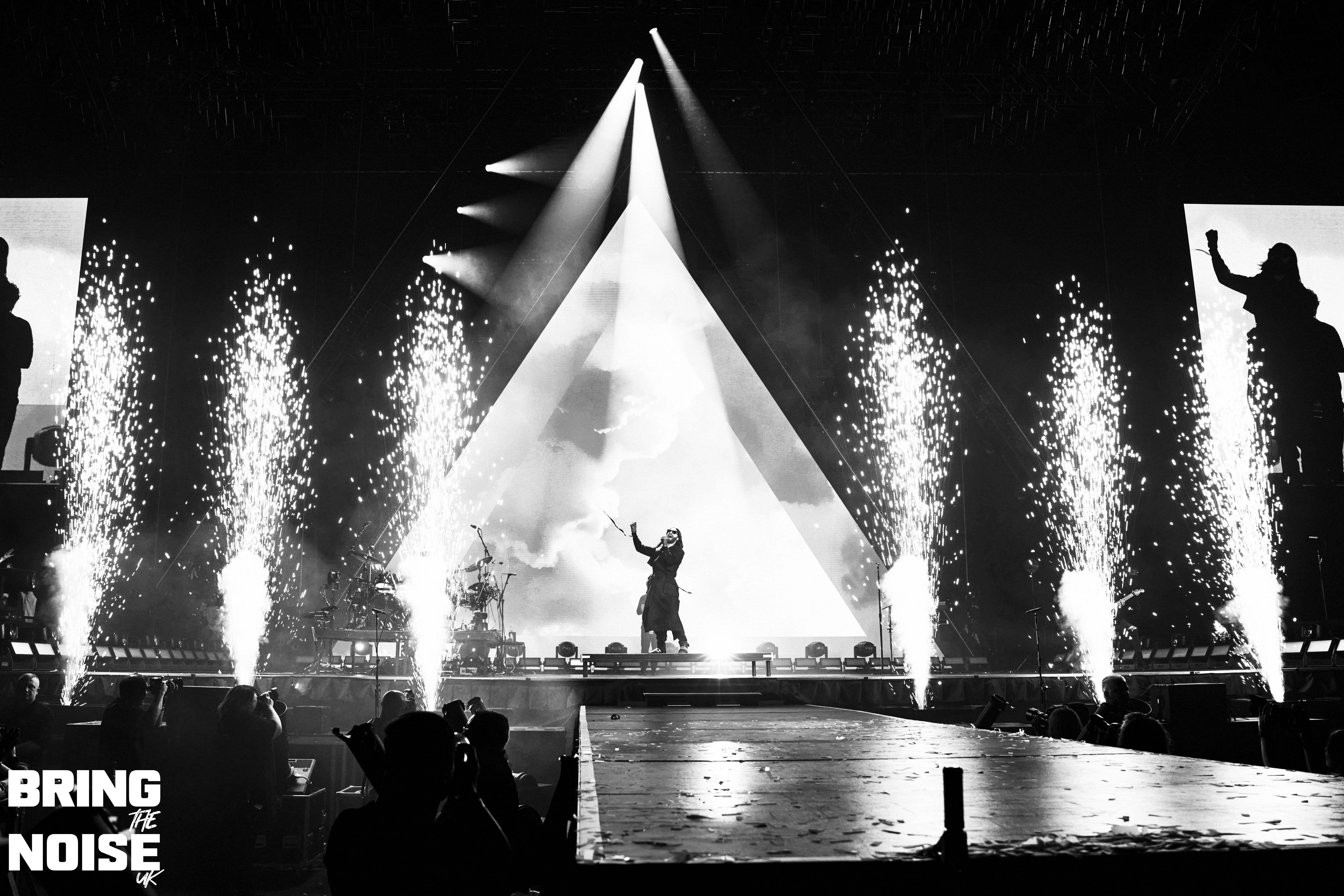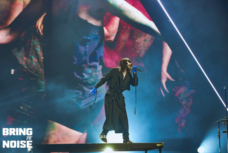 As the countdown for take off from 100 down to 30 appears on the huge screens Thirty Seconds To Mars enter the arena from the side of the stage, fist bumping the fans as the pass by amid great scenes. The Hydro arena setup tonight was interesting with a VIP cage perched up on either side of the stage and the fans split in two sections, front circle and real circle and a large walkway for the band/fans to get more intimate. The trio got down to entertaining the fans immediately with Up In The Air, one of two track taken from the 2013 album LOVE LUST FAITH + DREAMS, confetti cannons and pyrotechnics kept the excitement high for the 12000 or so in the arena, Kings and Queens prompts the first singalong of many tonight, this was the start everyone wanted. Jared Leto was dressed for the occasion in an orange and black tartan kilt, silver and red cape and black and white gloves looking as if he has come straight from a movie set, Shannon Leto also wore his kilt. We then had two tracks from 2018’s AMERICA album starting with Walk On Water prompting another singalong from the crowd followed by Rescue Me a very memorable moment as Leto hand picks a few fans to join in for some Scottish dancing, one of the highlights of the night, the crowd interaction here was special. Next up is Seasons, the first of only three from the bands latest released album It’s The End Of The World But It’s A Beautiful Day, the acoustic intro as the drummer moves to the front of the walkway alongside Leto.