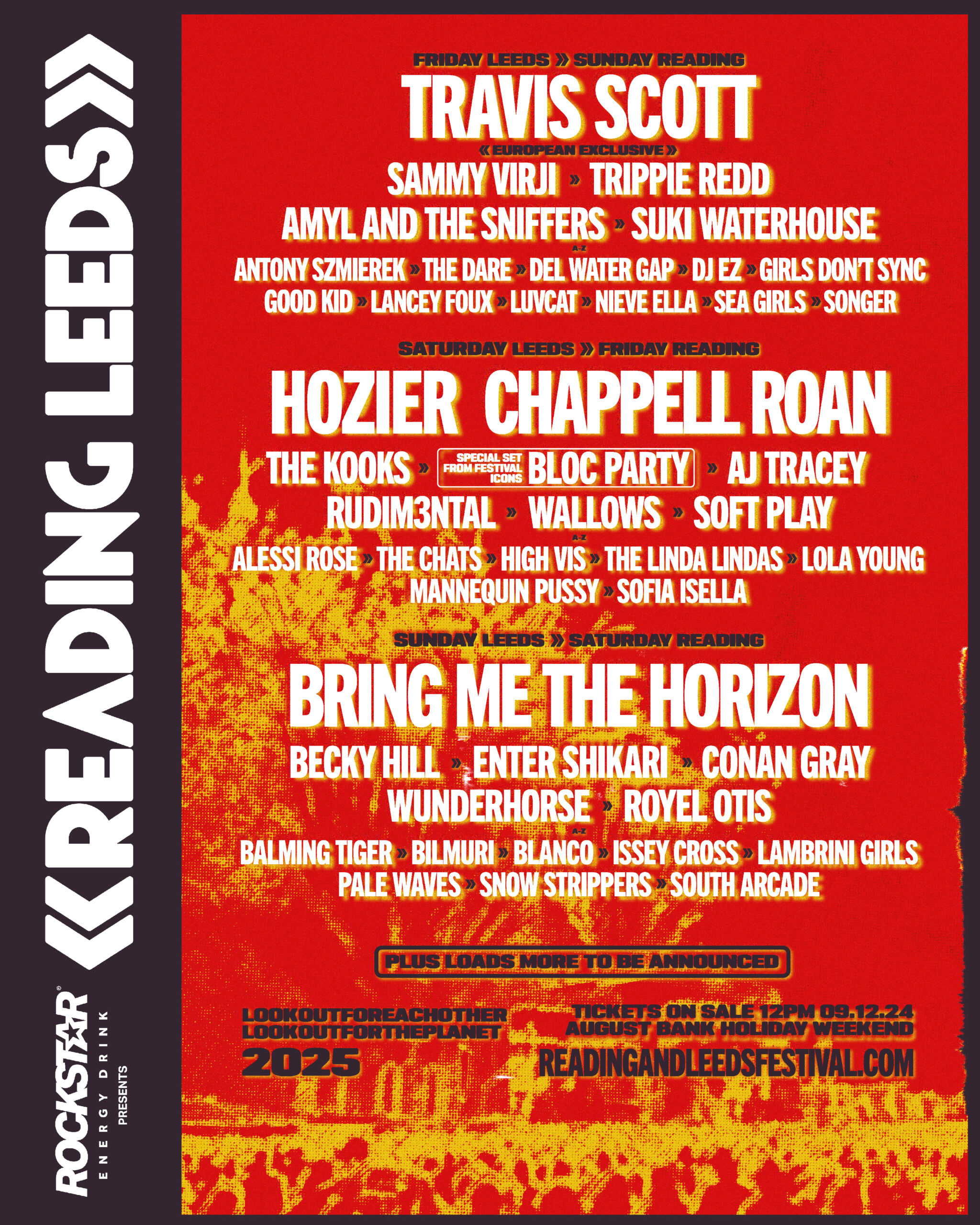 Headliners Chappell Roan, Hozier, Bring Me The Horizon and Travis Scott have been confirmed, alongside AJ Tracey, Becky Hill, Enter Shikari, The Kooks, Bloc Party, Amyl and The Sniffers, High Vis, Bilmuri, Mannequin Pussy, Lambrini Girls, Soft Play, Pale Waves, The Chats, Wallows, The Linda Lindas, South Arcade and many more.
